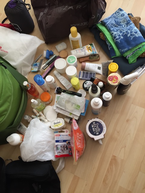 Kosmetika werden reduziert. Das Wichtigste für mich ist Sonnencreme mit hohem Lichtschutzfaktor für empfindliche Haut, und die möchte ich nur hier kaufen. Egal, wo auf dieser Welt ich bisher war, die ist meist teuer. Und Deo, ebenfalls für empfindliche Haut und ohne Aluminium. Das Gewohnte muss mit. Alles andere bekomm ich in größeren Orten. Duschgels, die in sämtlichen Hostels und Unterkünften zur Verfügung stehen, von anderen Leuten zurückgelassen werden (weil der Koffer aus allen Nähten platzt), habe ich im Lauf der Reise durch Seife ersetzen gelernt. Absolut platzsparend und die Plastik-Flasche fällt weg. Die Frage, was wichtig ist im Leben, kommt schon mal vor Reiseantritt auf.