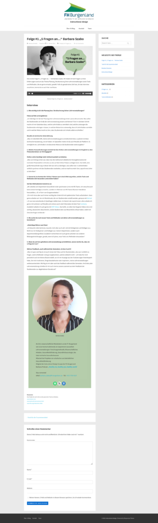 Weiters ist die Kategorie „5 Fragen an…“ für unsere Interviewserie verfügbar. Vier Gespräche sind zur Veröffentlichung an festgesetzten Terminen in den kommenden Monaten vorbereitet. Eine integrierte Kommentarfunktion unter den Podcast-Folgen, die Vorstellung des Interviewten mit der Möglichkeit für Verlinkung und Hinweis zu eigenen Aktivitäten in sozialen Medien oder zu Projekten runden das Basiskonzept ab und sollen den departmentübergreifenden Austausch von Methodik unter Lehrenden fördern.